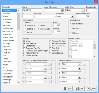 The Discounts Window is used to establish and maintain Discounts. Discounts may be applied to Menu Items and Gift Cards. Discounts may be a percentage or a dollar amount and may be used to enter coupons or promotions.