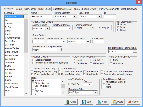The Locations Window is used to establish the basic attributes such as the Name, Revenue Center, Order Type and applicable Taxes for up to 50 Locations.